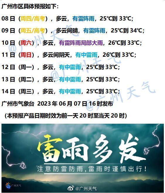 广州方面,展望今明还是多云,有雷阵雨出没,赴考时段可能有雷雨影响,考生及家长要属意天气变化。