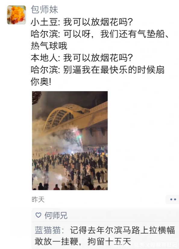 南边小土豆思放烟花,你立马运行烟花秀,还搬出了气垫船,热气球。腹地东说念主说我思放烟花,你说别逼我在最自得的时候扇你。既然提到了哈尔滨这座城市,也不得不提到哈尔滨一样有名的阐扬。