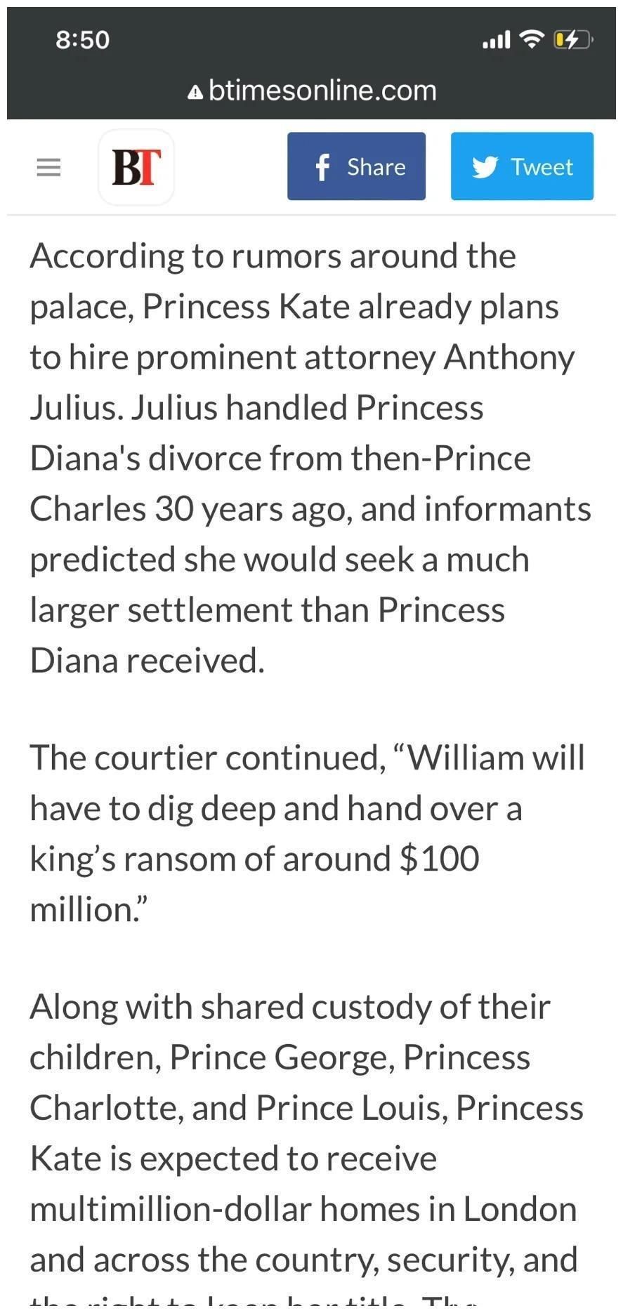 报谈凯特仳离的是《生意内幕》杂志,杂志中默示凯特和威廉的婚配如故出现了危境,为了仳离的地步,凯特为此如故遴聘了知名讼师安东尼·朱利叶斯,她亦然戴安娜王妃的仳离讼师。若是安东尼·朱利叶斯能为凯特争取到她建议的要求,讼师将得到一笔腾贵的佣金。